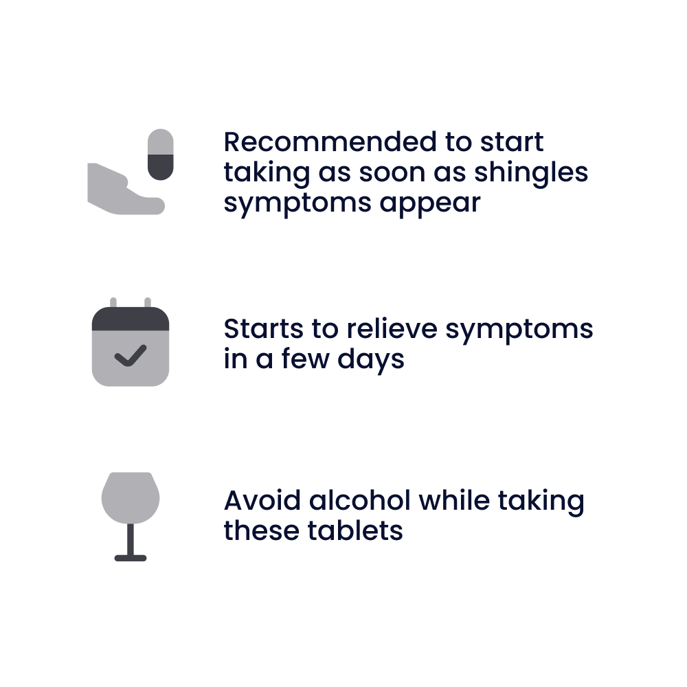 Although it does not eliminate the virus from the body, prompt treatment can shorten the duration of the outbreak and lower the risk of complications such as long-term nerve pain. These tablets are usually taken several times a day for a short course.
