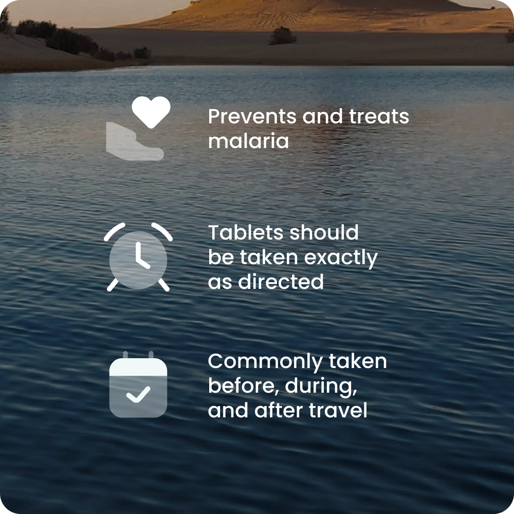 It is commonly taken before, during, and after travel to malaria-risk areas as prescribed, and may also be used to treat certain other parasitic infections or autoimmune conditions like lupus. The tablets should be taken exactly as directed to ensure effective protection and reduce the risk of side effects.