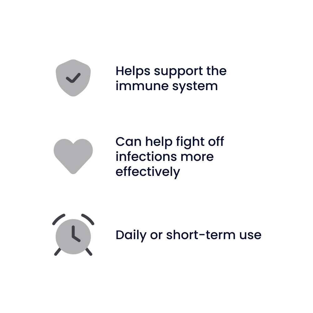 Echinacea is thought to work by stimulating the body’s natural defences, helping it fight off infections more effectively. The tablets are usually taken daily for short-term use, particularly at the first sign of illness. While generally well tolerated, they should be used as part of a balanced approach to maintaining immune health.