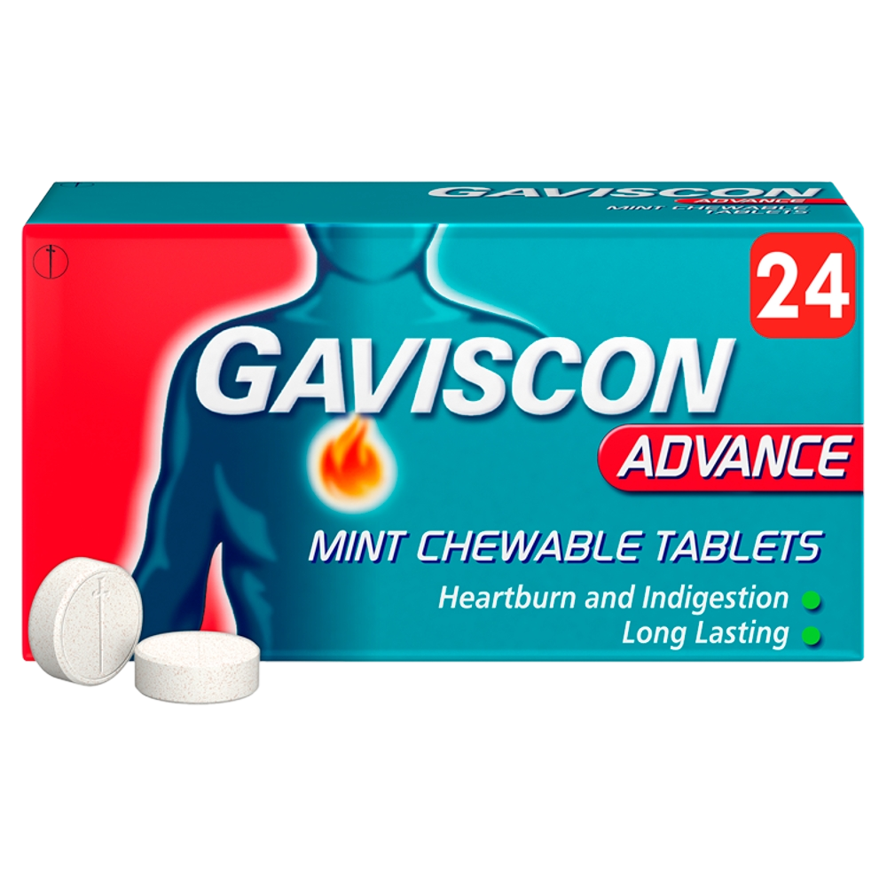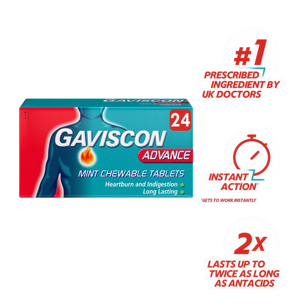 Gaviscon Advance Heartburn & Indigestion Tablets are used to relieve the symptoms of heartburn, acid indigestion, and reflux. They contain sodium alginate, which forms a protective layer that floats on top of the stomach contents, helping to prevent acid from flowing back into the oesophagus, and potassium bicarbonate, which neutralises excess stomach acid. This dual action provides fast, long-lasting relief and helps protect the lining of the oesophagus from irritation.