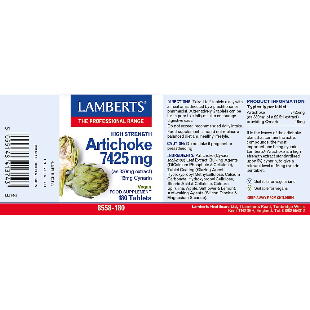 Lamberts Artichoke Tablets 7425mg contain a concentrated extract of artichoke leaf, traditionally used to support healthy digestion and liver function. Artichoke extract is a natural source of cynarin, which is thought to help stimulate bile production, aiding the breakdown of dietary fats and supporting overall digestive comfort.