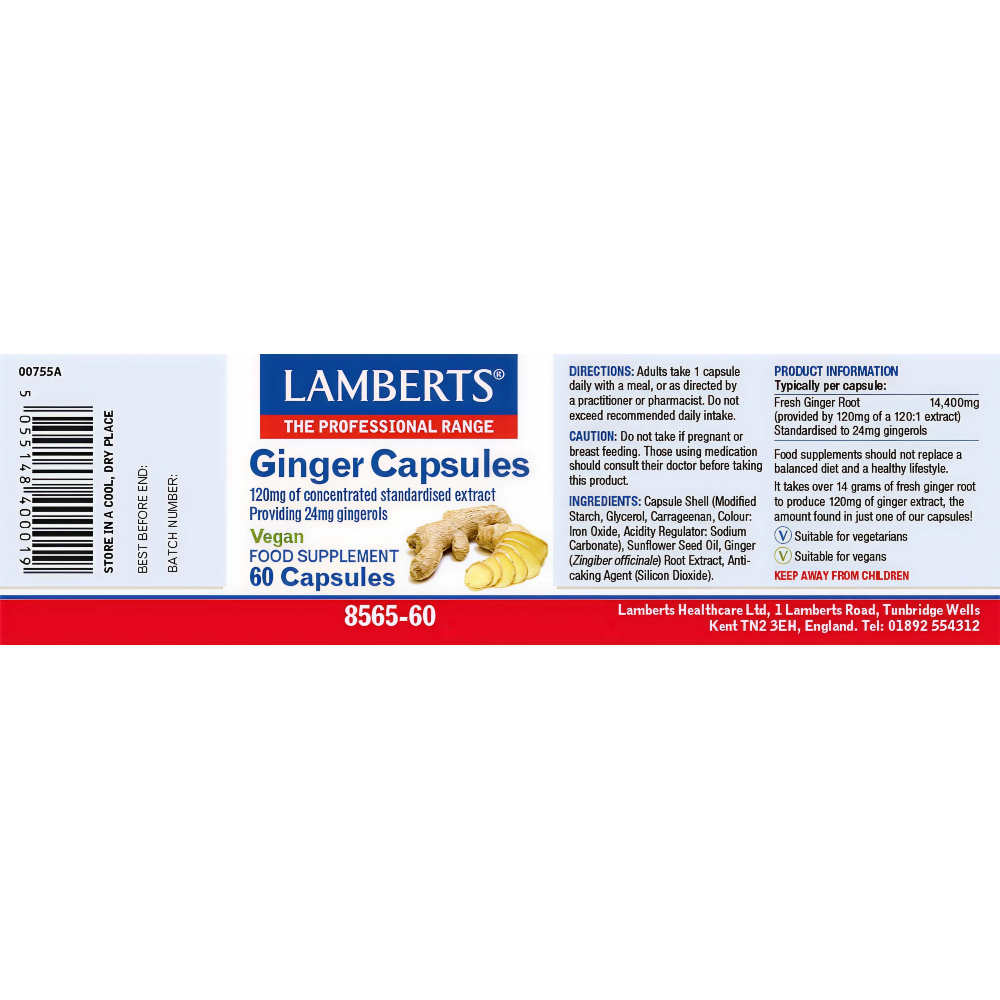 Lamberts Ginger Capsules contain a concentrated extract of ginger root, a traditional herbal remedy known for supporting digestion and helping to relieve nausea. Ginger’s natural compounds, including gingerols and shogaols, have anti-inflammatory and antioxidant properties, and may also help ease symptoms of motion sickness, mild indigestion, and bloating.