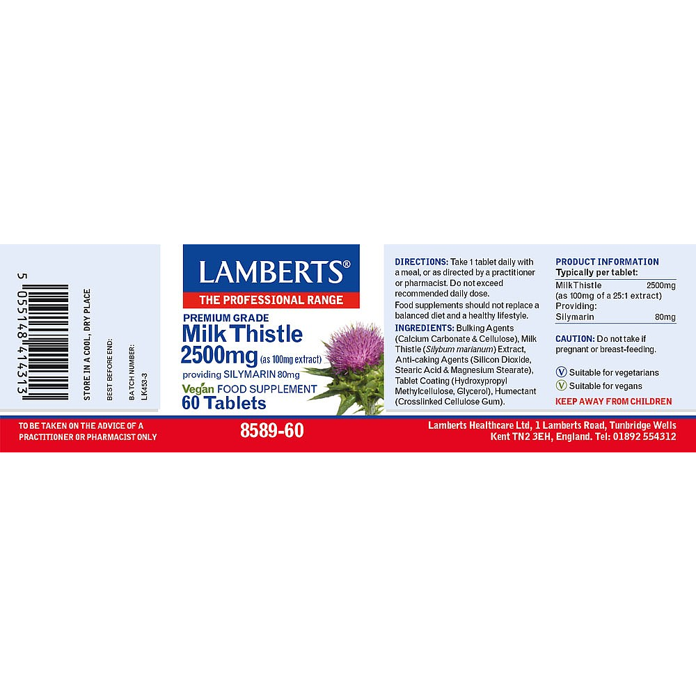Lamberts Milk Thistle 2500mg provides a concentrated extract of Silybum marianum, a plant traditionally used to support liver health. The active component, silymarin, is thought to act as an antioxidant, helping to protect liver cells from free radical damage and supporting the organ’s natural detoxification processes.